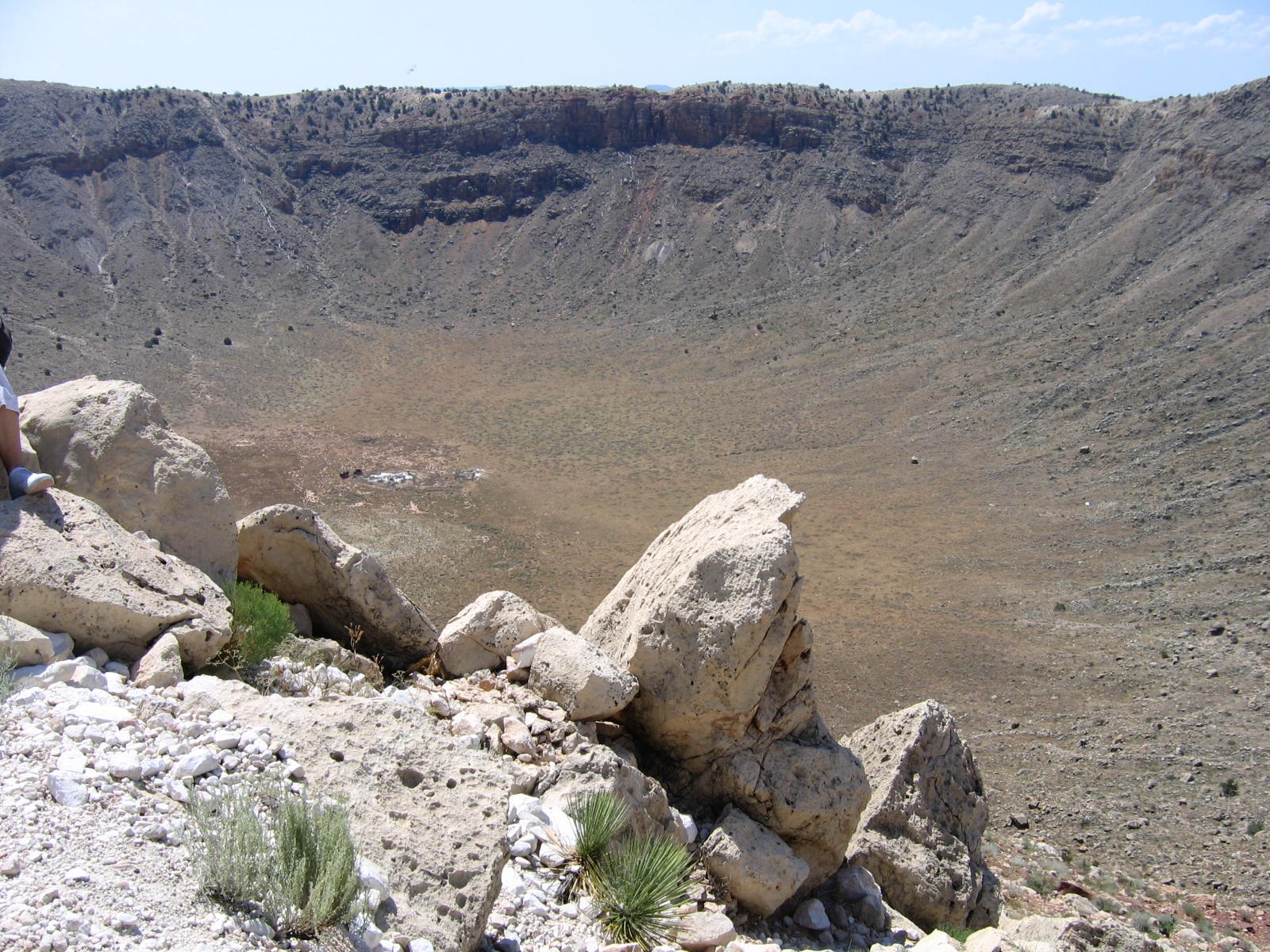 Next day we stopped by at Meteor Crater for the guided tour. This was one of the prime movers in us deciding to do the trip. The small white area in the middle is the head of an old mine. Test pits dot the area. Again, difficult to scale, but the old mine has a six foot fence around it and the two dark shapes to the left of it are a couple of old tanks (liquid containers) each about 15 feet long.
