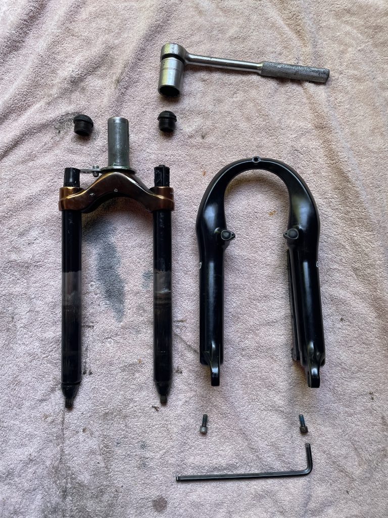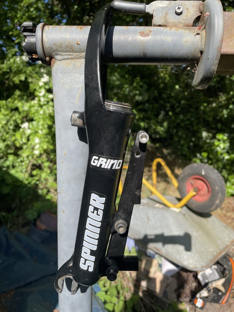 After some searching on Youtube, I couldn’t find a strip down of the same fork, but there were videos of similar coil-sprung forks. I decided to buy a new set. It seemed the Grind was no longer made, but through JD Tandems I purchased the Spinner 300 20″ fork as a replacement. Note, the fork has a steerer clamp at the crown, specific to the Pino, so ‘any’ 20″ fork is not suitable.