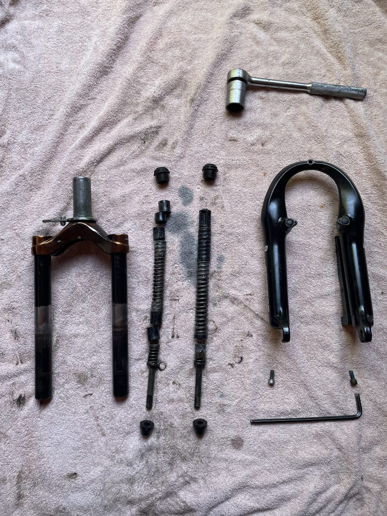 Once the forks are stripped down, everything can be cleaned and regreased. The tubes, especially the outers, can collect moisture which in turn can rust the inner surfaces and those of the uppers. The same can happen to the springs. It may be necessary to use a spirit based cleaning liquid to break down the old grease and oil before applying new.